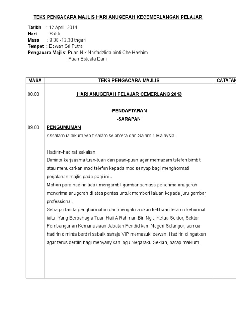 Teks Pengacara Majlis Hari Anugerah Kecemerlangan 2013 Pdf