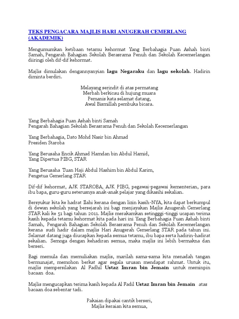 Teks Pengacara Majlis Hari Anugerah Kecemerlangan Akademik Pdf